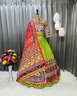 Green Multicolor Fancy Digital Print With Real Mirror Work Navaratri Lehenga Choli