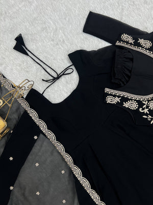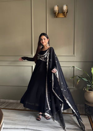 The Black Pure Fox Georgette Embroidery Sequence Work Suit is a stunning combination of elegance, glamour, and traditional craftsmanship. Crafted from premium pure fox georgette fabric, this designer salwar suit offers a lightweight feel with a graceful and stylish drape.