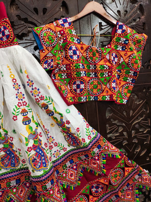 White Pure Reyon Cotton Kutchi Embroidery Work Fully Stiched Navratri Lehenga Choli