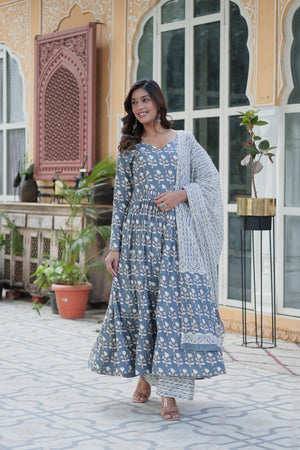 Grey Pure Cotton Readymade Kurti With Pant Dupatta Set