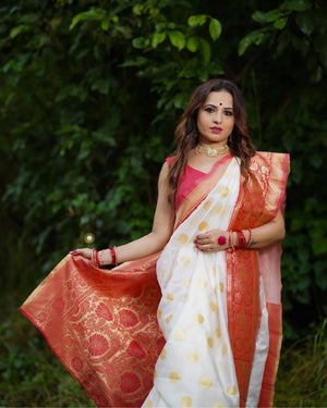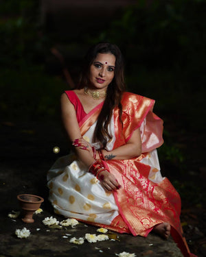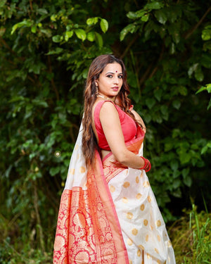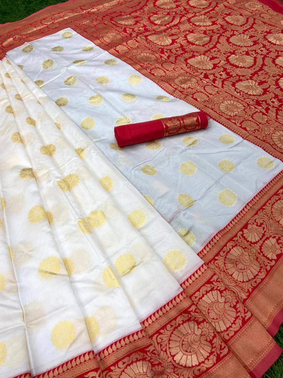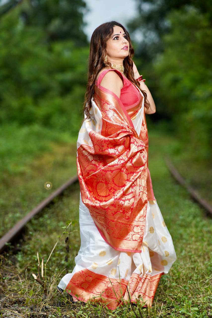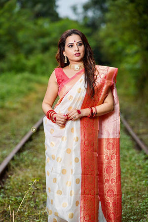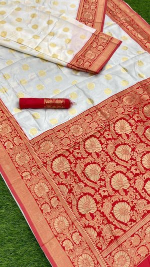 White And Red Combination With Red Blouse Banarasi Beautiful Saree With Beautiful Tassels