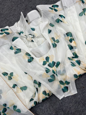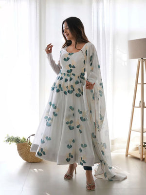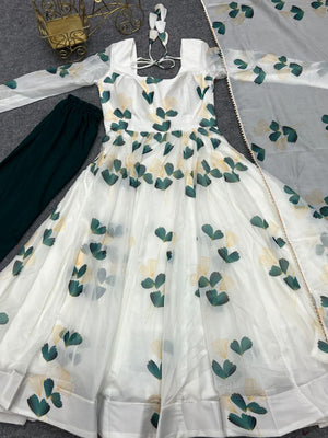 White Colour Digitally Printed Pure Soft Organza Anarkali Suit With Huge Flair Comes With Duppatta N Pant