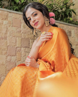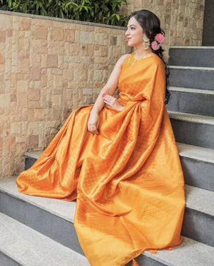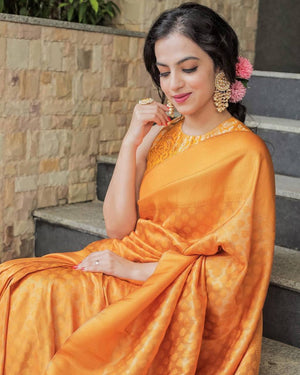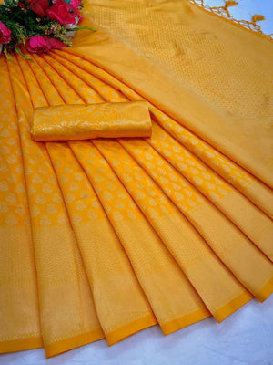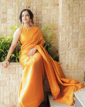 Wedding Yellow Golden Zari Weaving Banarasi Beautiful Saree With Blouse With Beautiful Tassels