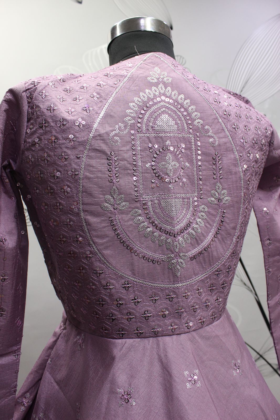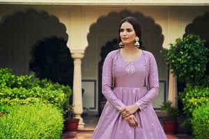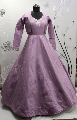 This Lavender Colored Gown Is Made From Pure Cotton Fabric Which Is Highlighted With Beautiful Sequins Work. This Gown Comes Along With Crepe Lining And Sequins Embroidered Stitched Pure Cotton Koti. Women Can Buy This Gown To Wear For Their Parties, Functions And Events.