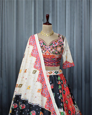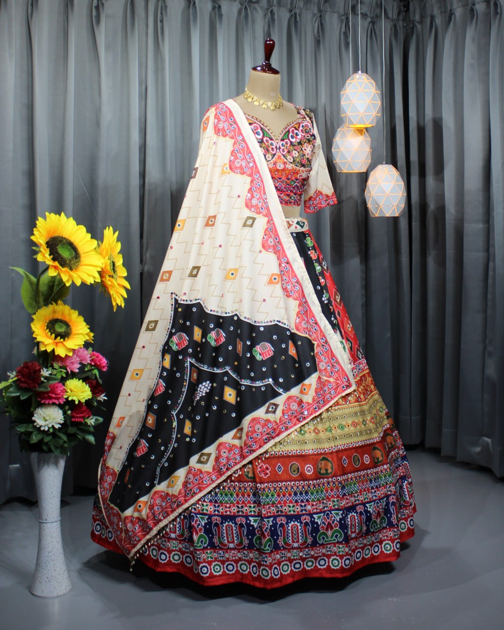 Off White Colour Fancy Digital Print Work And Real Mirror Work Navratri Lehenga Choli