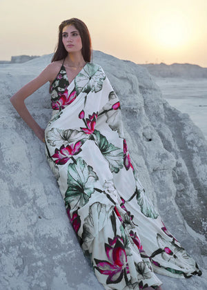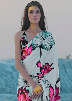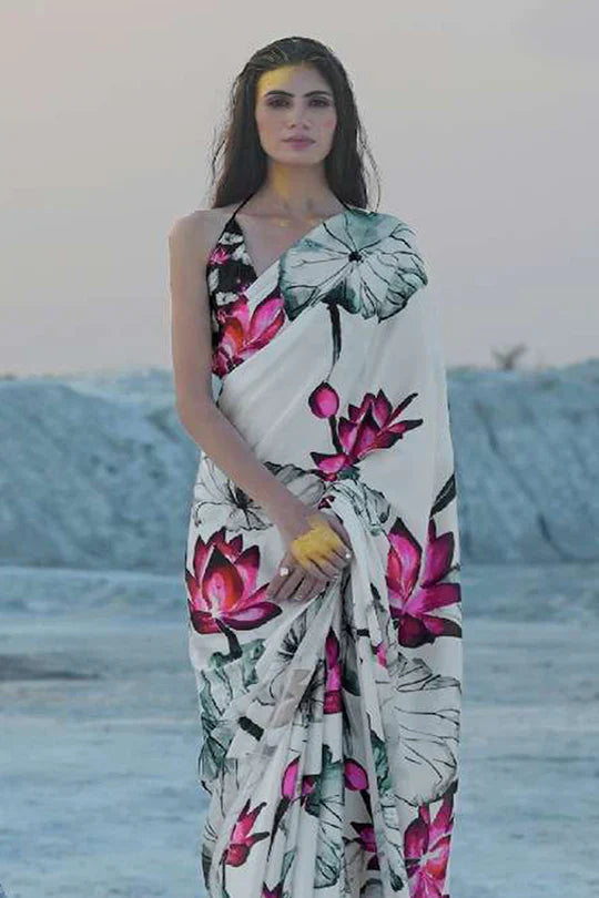 Daisy White Color Polka Dot Pure Sattin Crepe Saree And Digital Print Blouse