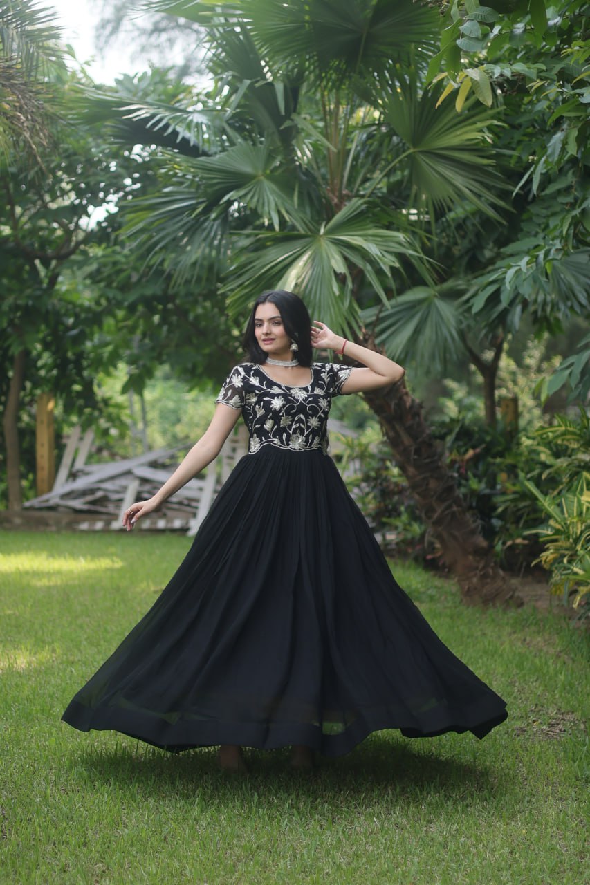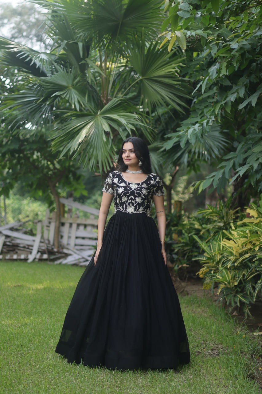 Black Colour Faux Blooming With Coding Sequins Embroidered Work Gown