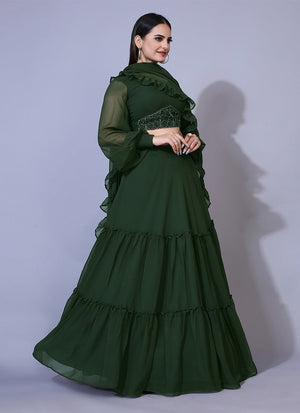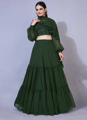 Dark Green Solid Colored With Handwork Georgette Lehenga Choli