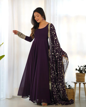 Wine Colour New Georgette Anarkali Gown Duppta Full Set With Pent