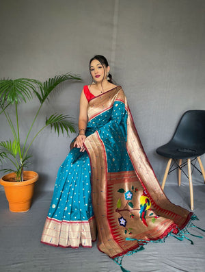 Cyan Blue Pure Paithani Silk Saree With Paithani Rich Weaved Pallu With Tassels And Unique Mottif Pattern