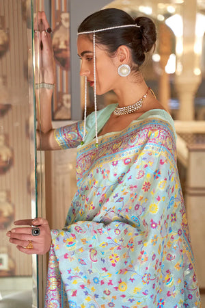 Stylish Sky Colour Soft Handloom Weaving Silk Saree With Blouse