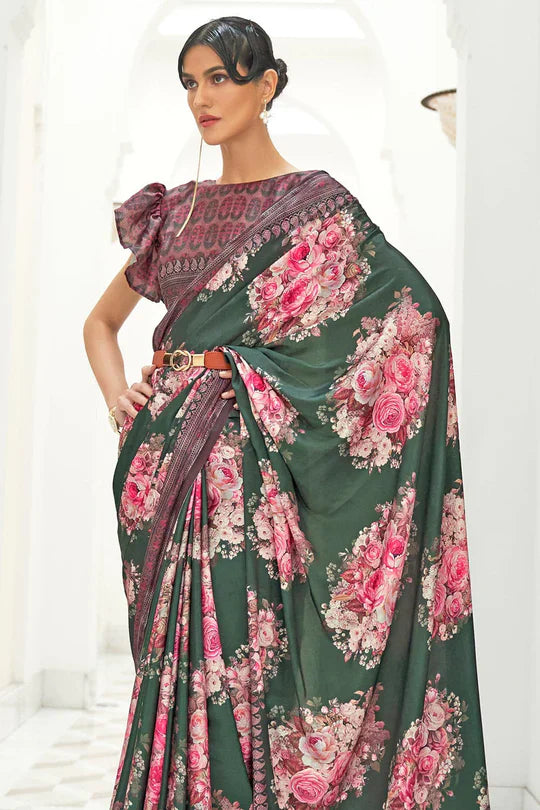 Dark Green Partywear Floral Digital Printed Silk Saree