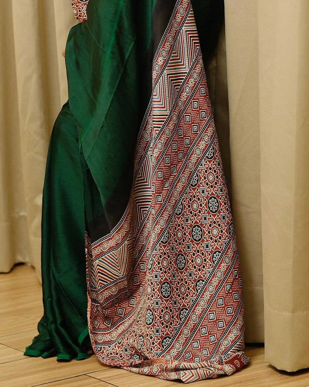 Dark Green Semi Gajji Silk Ajrakh Saree with Rich Pallu – Traditional Designer Saree