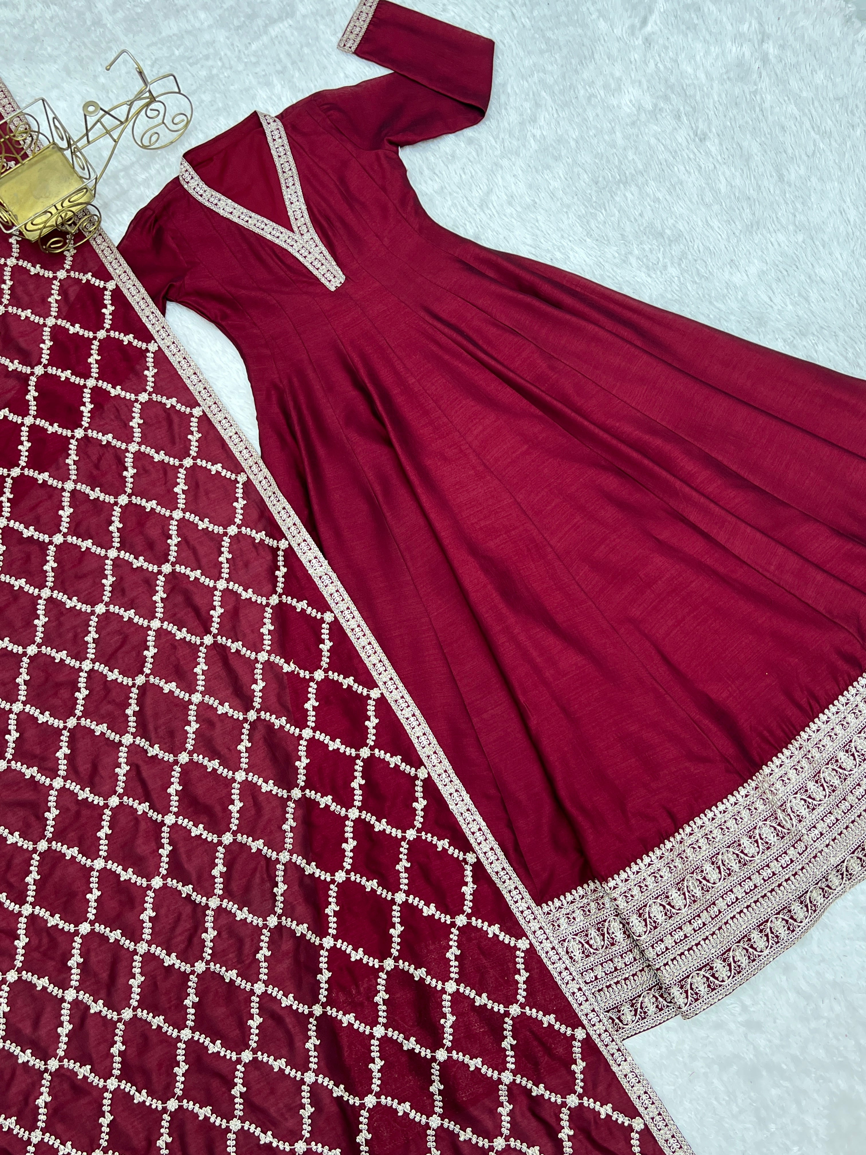 The Dark Maroon Pure Vichitra Silk Kali Pattern Anarkali Gown is a stunning blend of elegance, tradition, and modern fashion. Crafted from premium pure Vichitra silk fabric, this designer Anarkali gown offers a luxurious feel and a graceful flow.