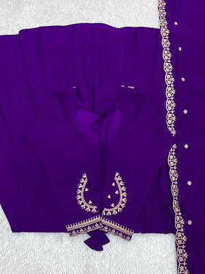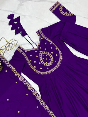 Purple Chanderi Silk Fabric Fancy Handwork Beads Full Flare Anarkali Suit