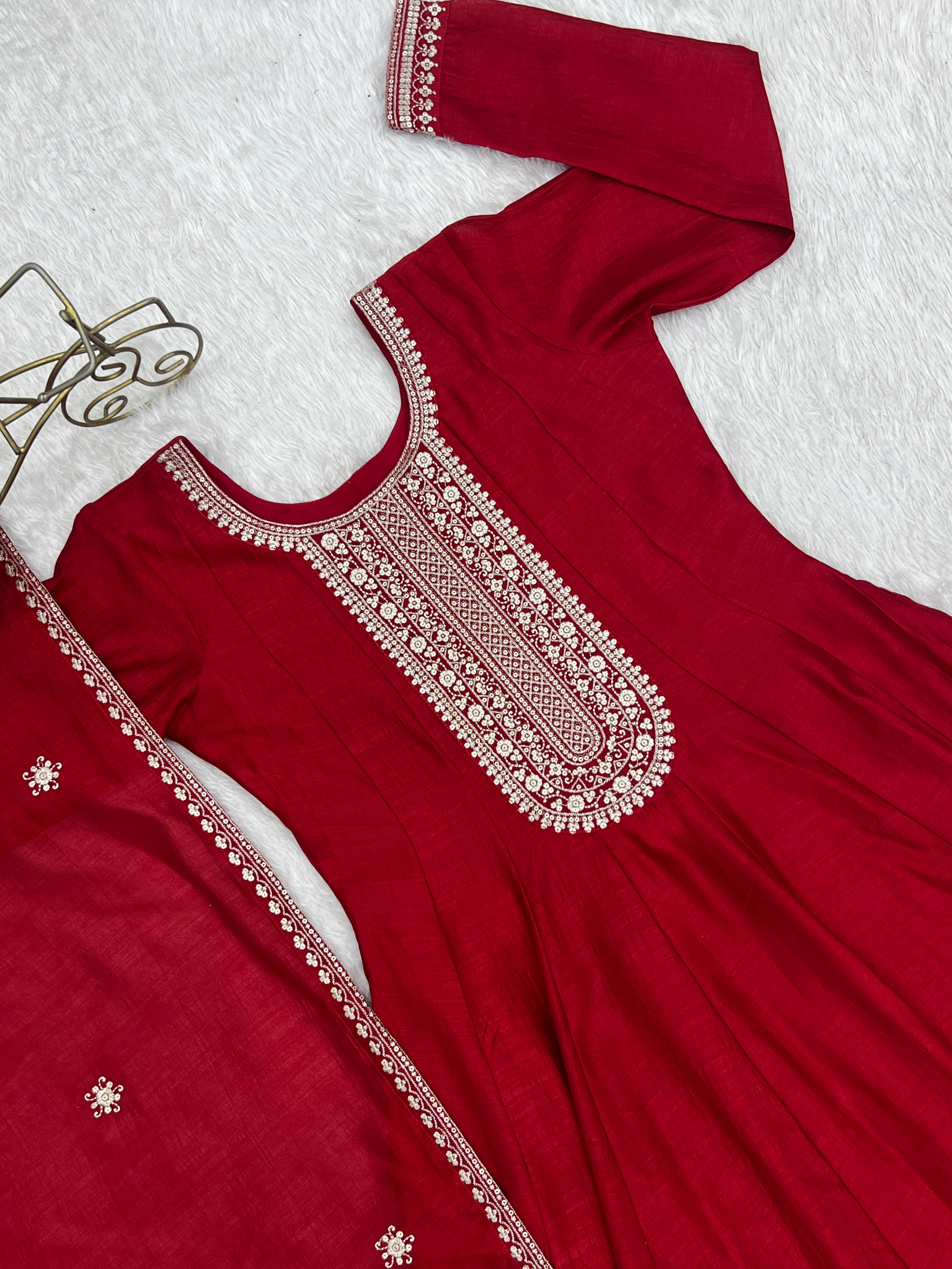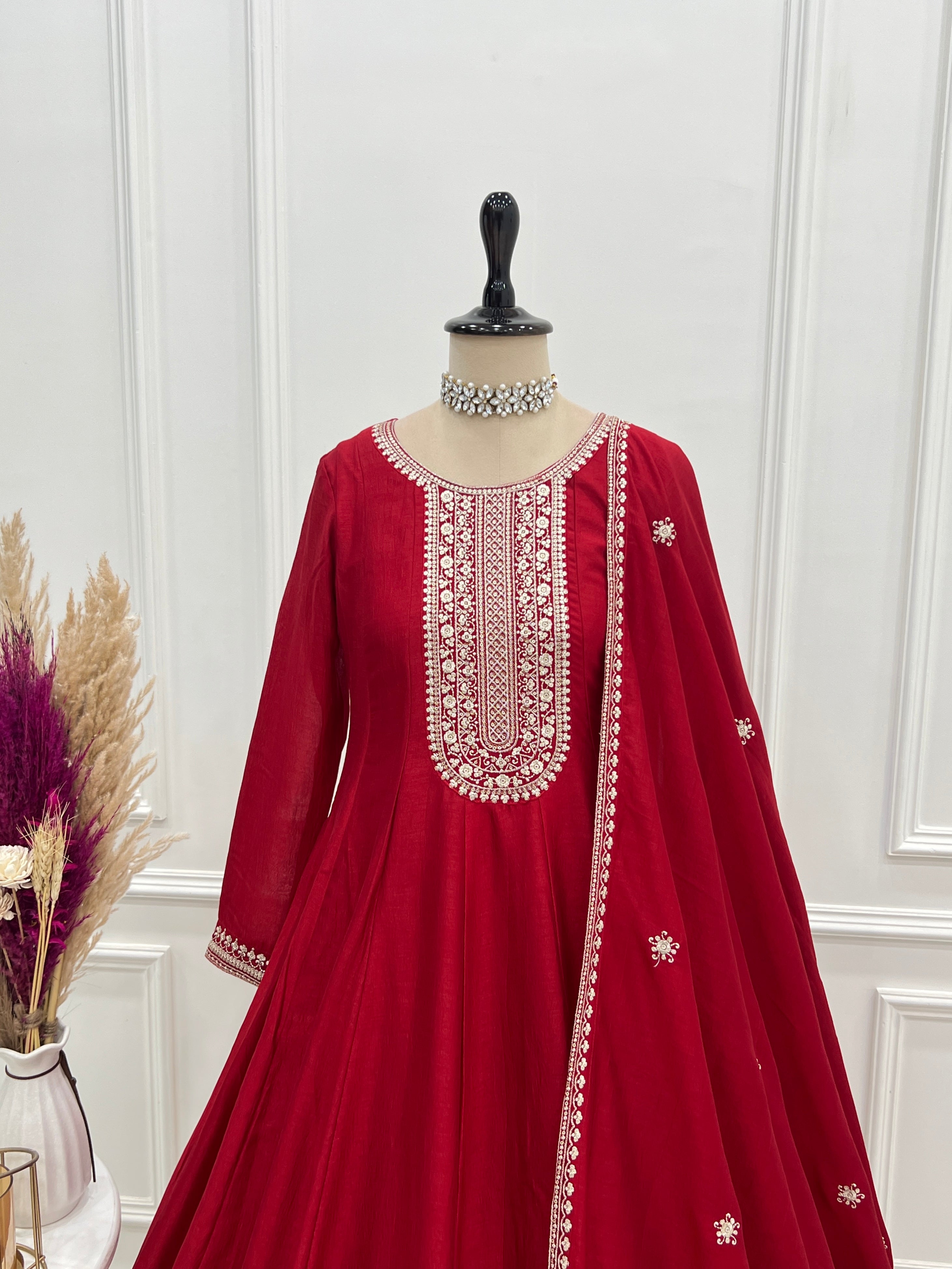 The elegant kali pattern design enhances the flare of the Anarkali, giving it a royal and graceful appearance. The rich dark red color adds a festive and sophisticated touch, making this outfit ideal for weddings, festive celebrations, parties, and special occasions.