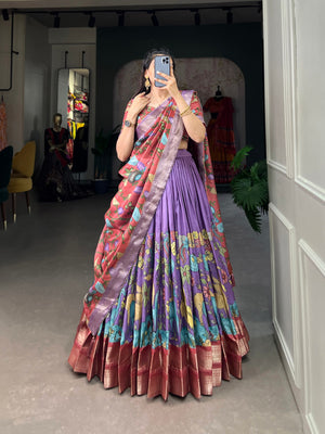 Lavender Color Kalamkari Dola silk charm With Weaving Border Stitched Lehenga Choli
