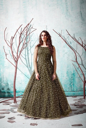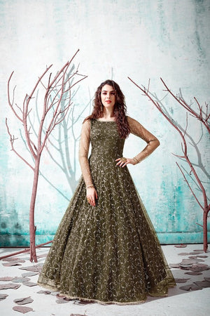 Olive Green NET Fabric Foil Printed Gown Collection