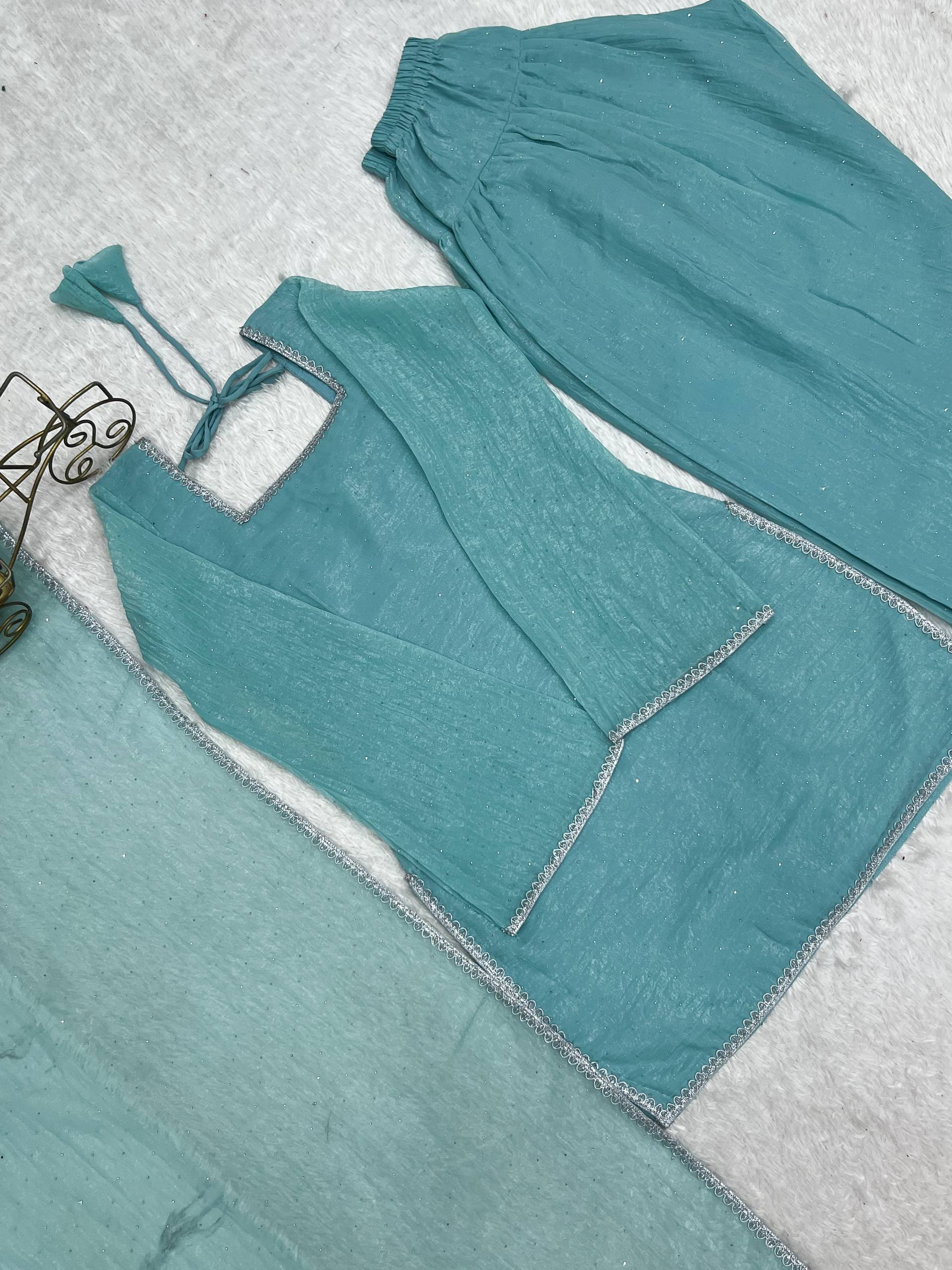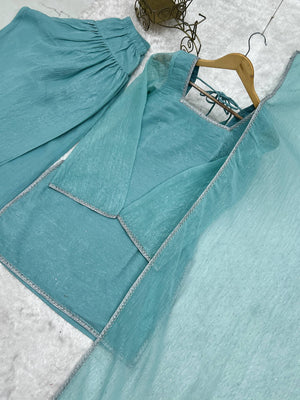 The Pastel Blue Crunchy Silk Fabric Siroski Work Salwar Suit is a stunning blend of elegance, modern style, and traditional craftsmanship. Crafted from premium crunchy silk fabric, this designer suit offers a luxurious texture with a graceful and comfortable fit.