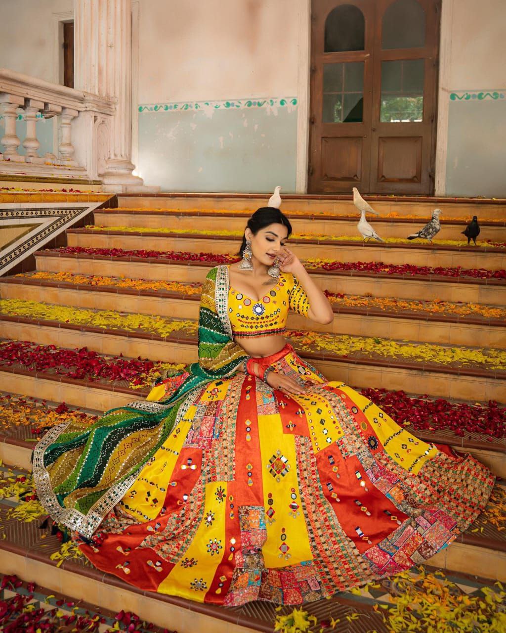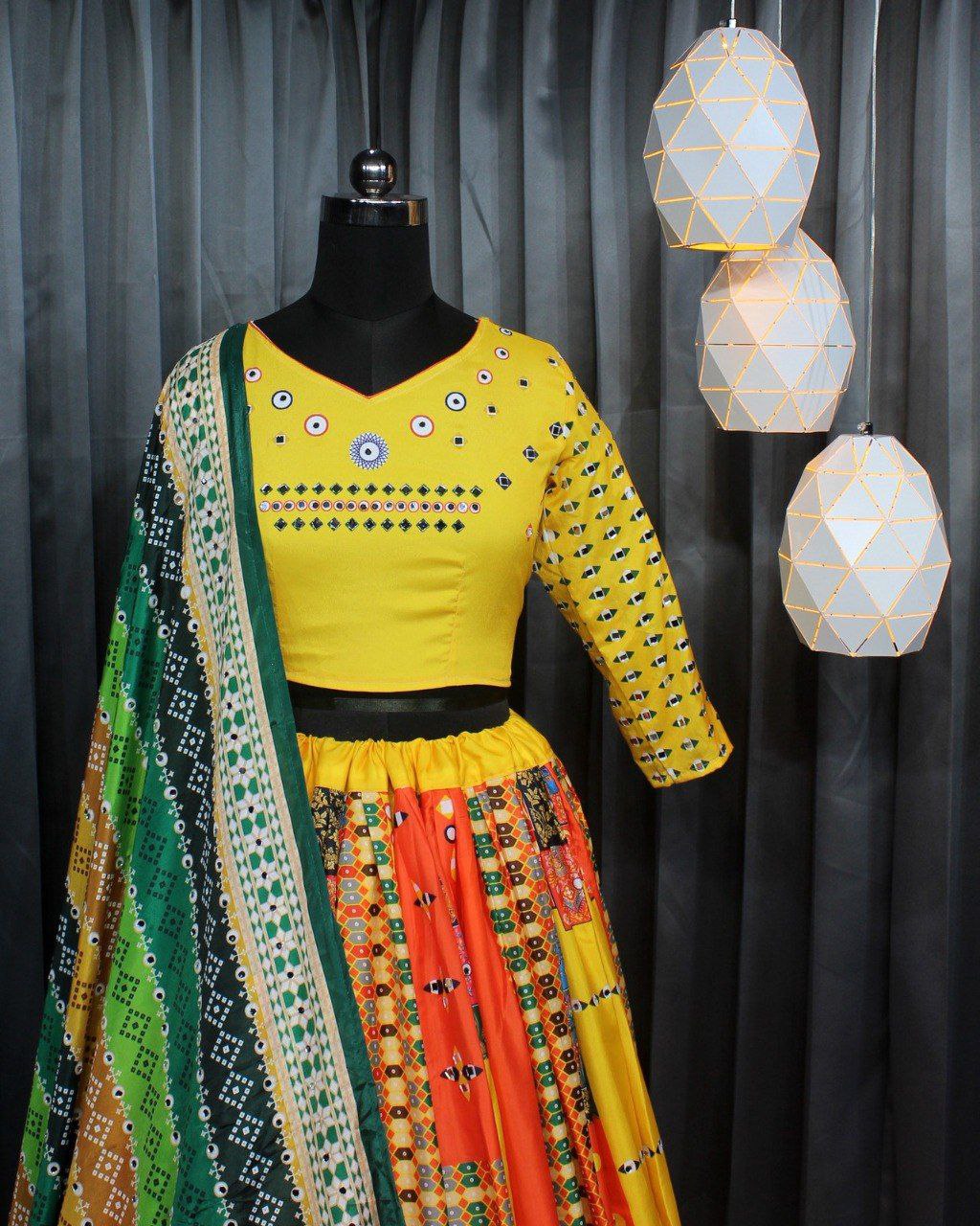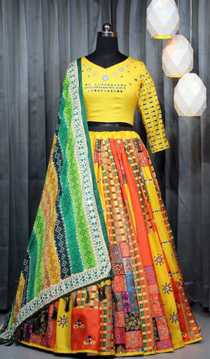 Yellow Multicolor Digital Print Real Mirror Work Navrati Lehenga