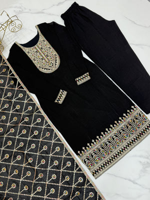 Black Pure Blooming Vichitra Silk Fabric With Beautiful Embroidery Sequence and Dori Salwar Suit