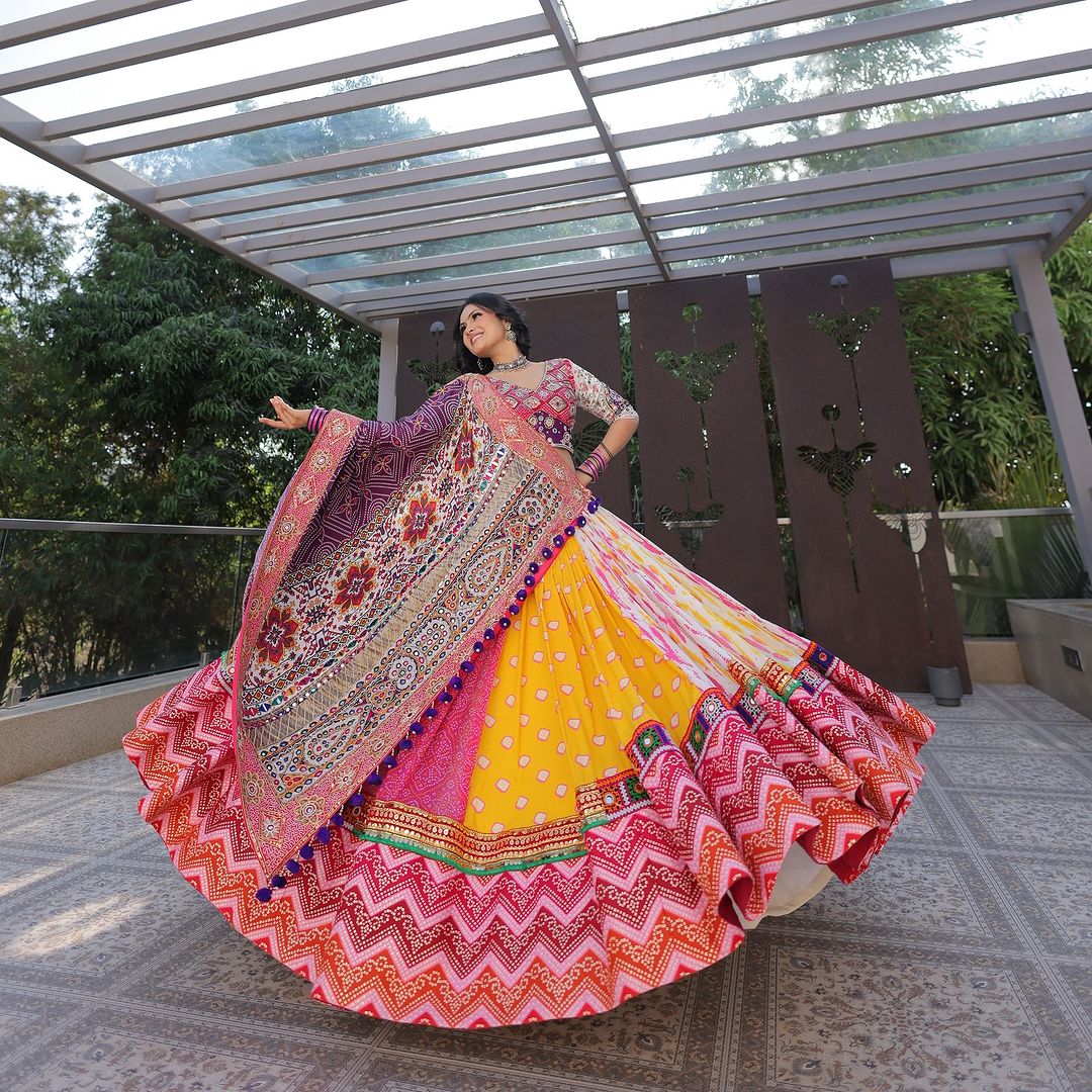 Pink Yellow Soft Butter Silk Fancy Digital Print Work and Real Mirror Work Navratri Lehenga