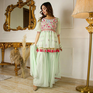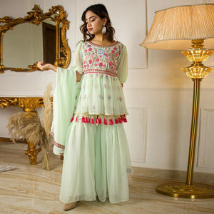 Pista Green Partywear Floral Embroidered Georgette Palazzo Suit With Dupatta