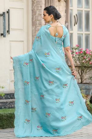 Sky Tussar Cotton Floral And Sequins Embroidery Work Saree