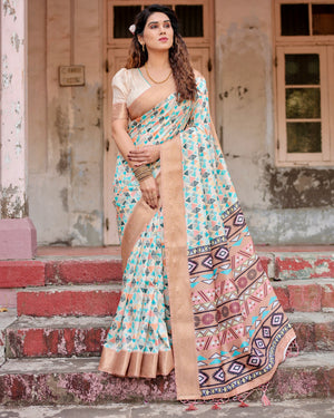 PURE SILK DIGITALLY PRINTED SAREE WEAVED WITH GOLDEN ZARI COMES WITH TASSELS