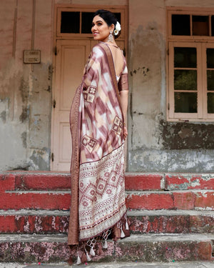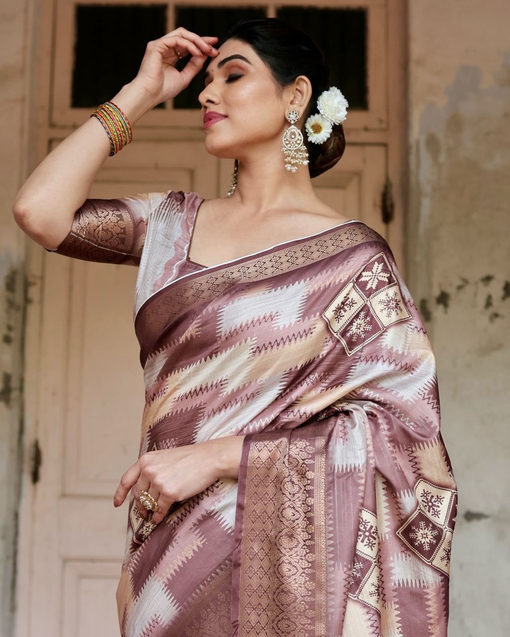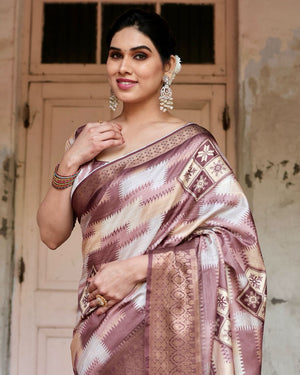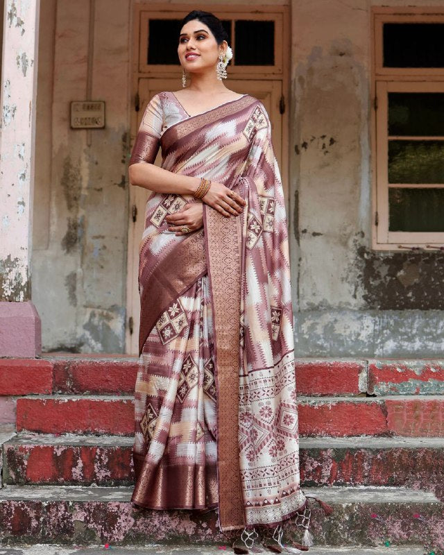 Pure Silk Digital Printed Saree, Exuding Regal Charm With Its Rich Pallu And Intricate Brocade Blouse, Elegantly Adorned With Enchanting Tassels On The Saree's Edge.