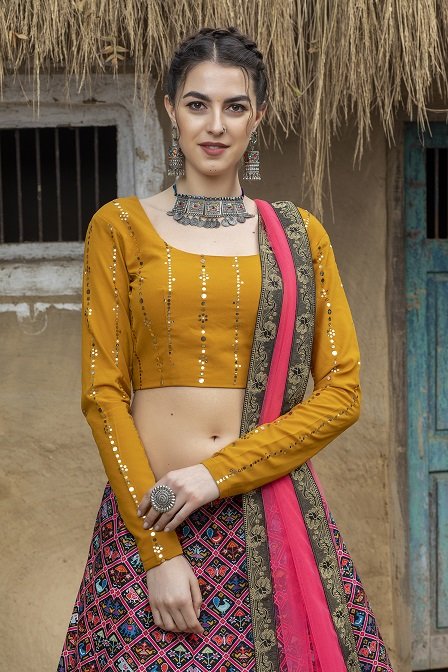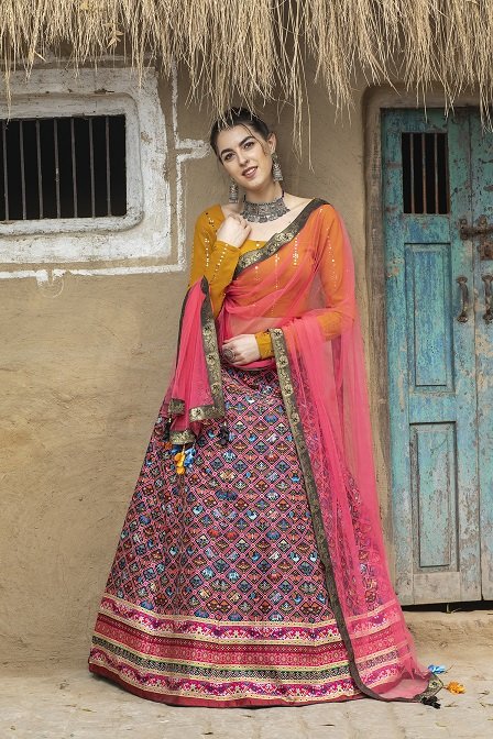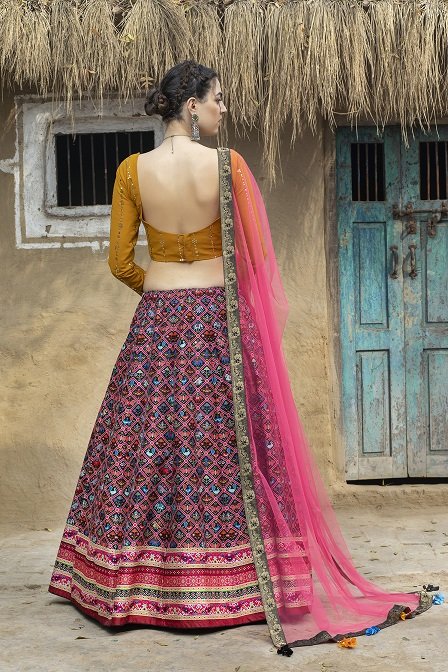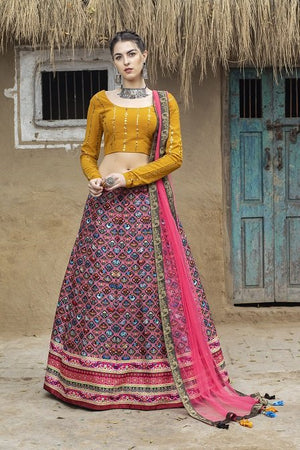 Black PRINTED semi-stitched lehenga and unstitched choli with dupatta.
