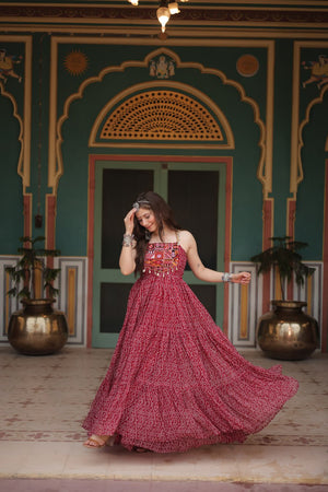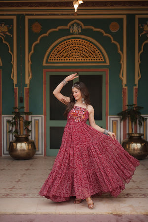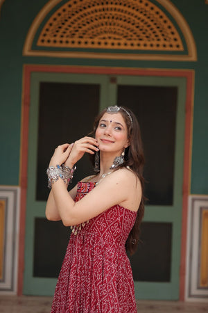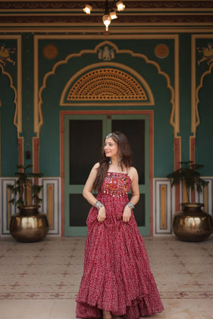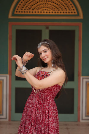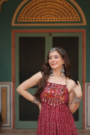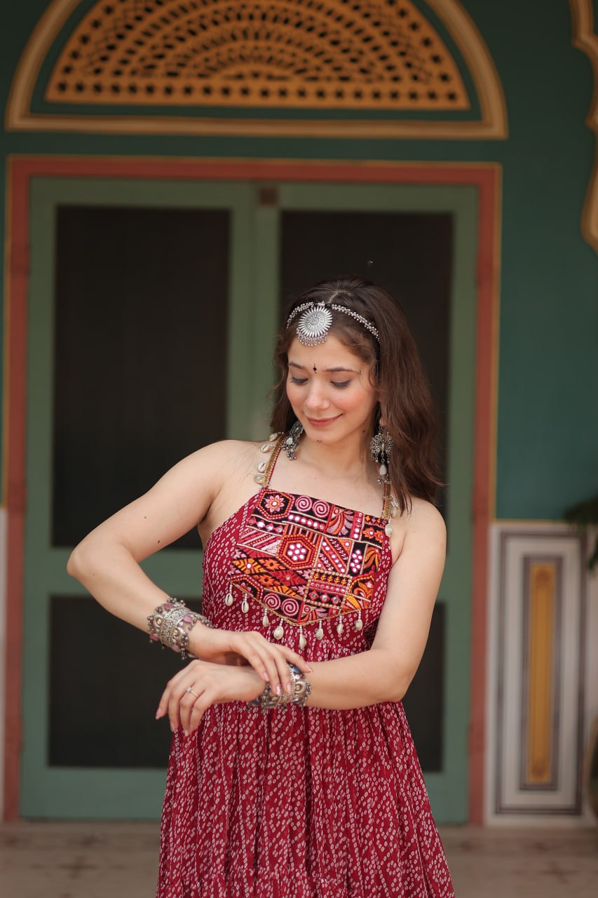 Maroon Color Bandhani Print Work with Kutchi Patchework in Faux Georgette Navratri Gown
