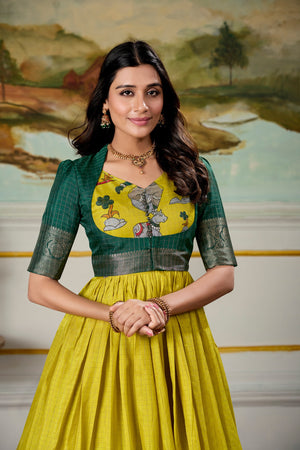 Parrot Dola Silk Kalamkari Print With Zari Weaving Broder Work Gown With Koti