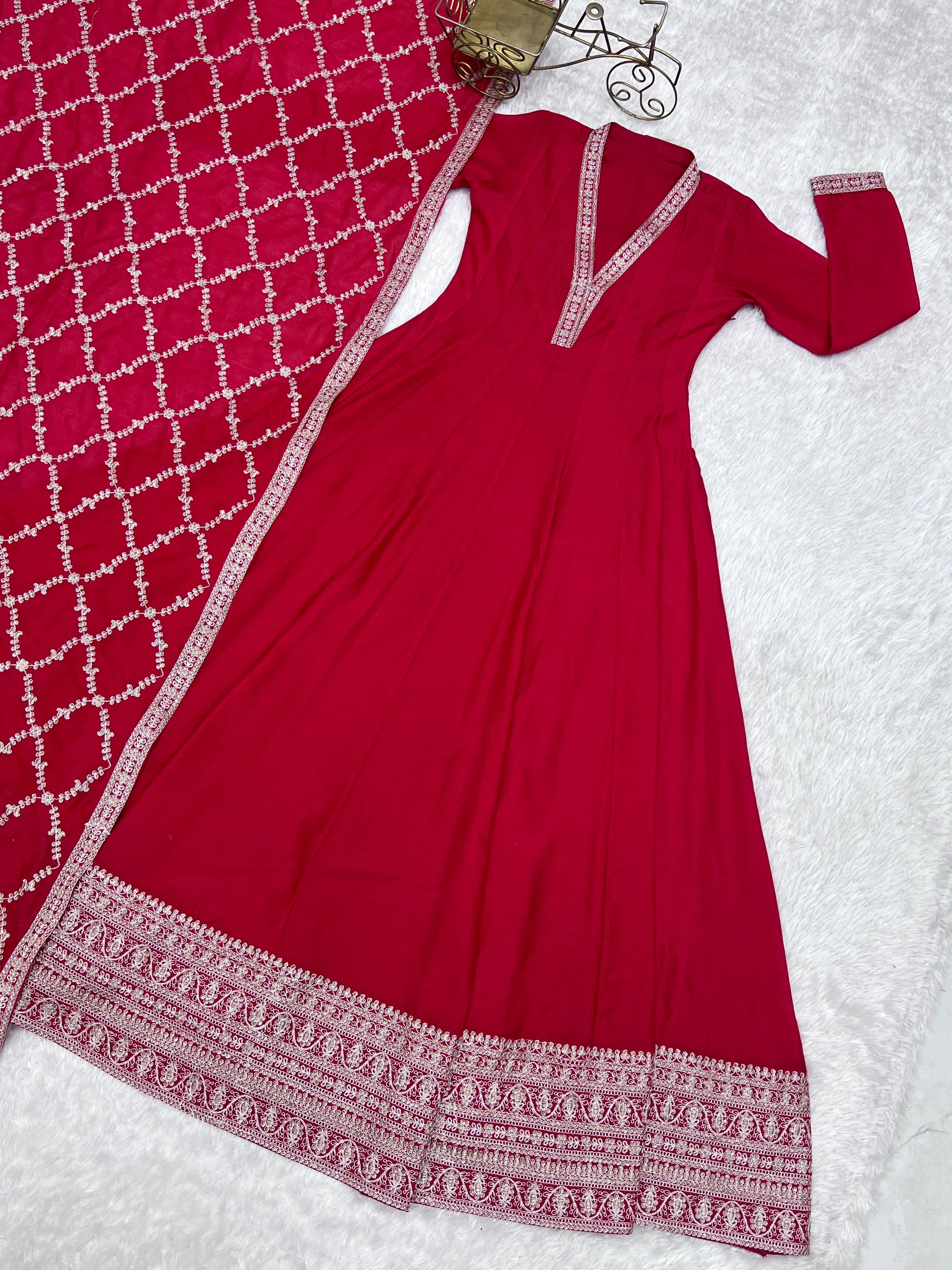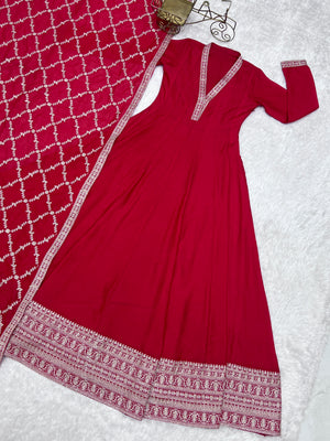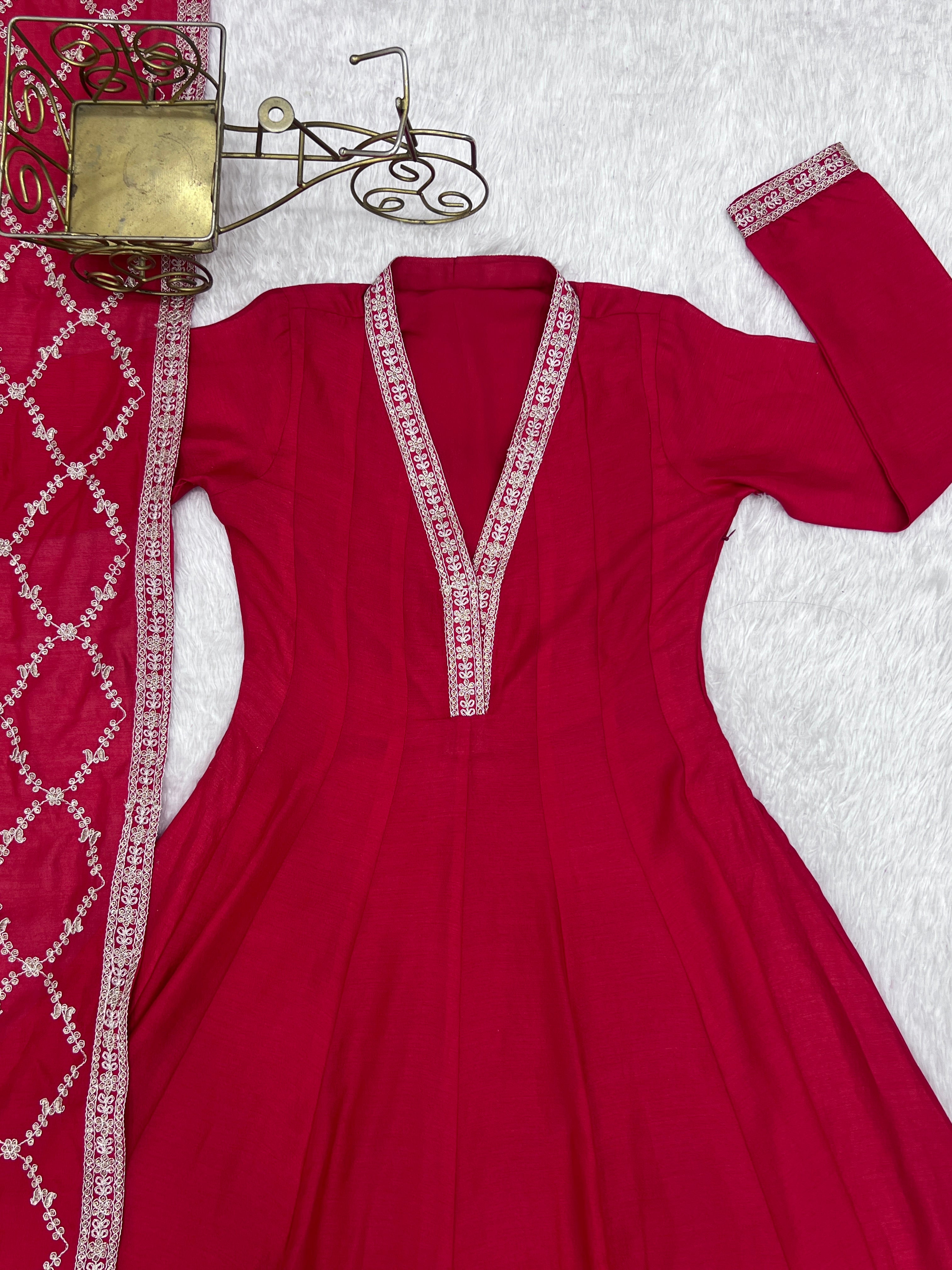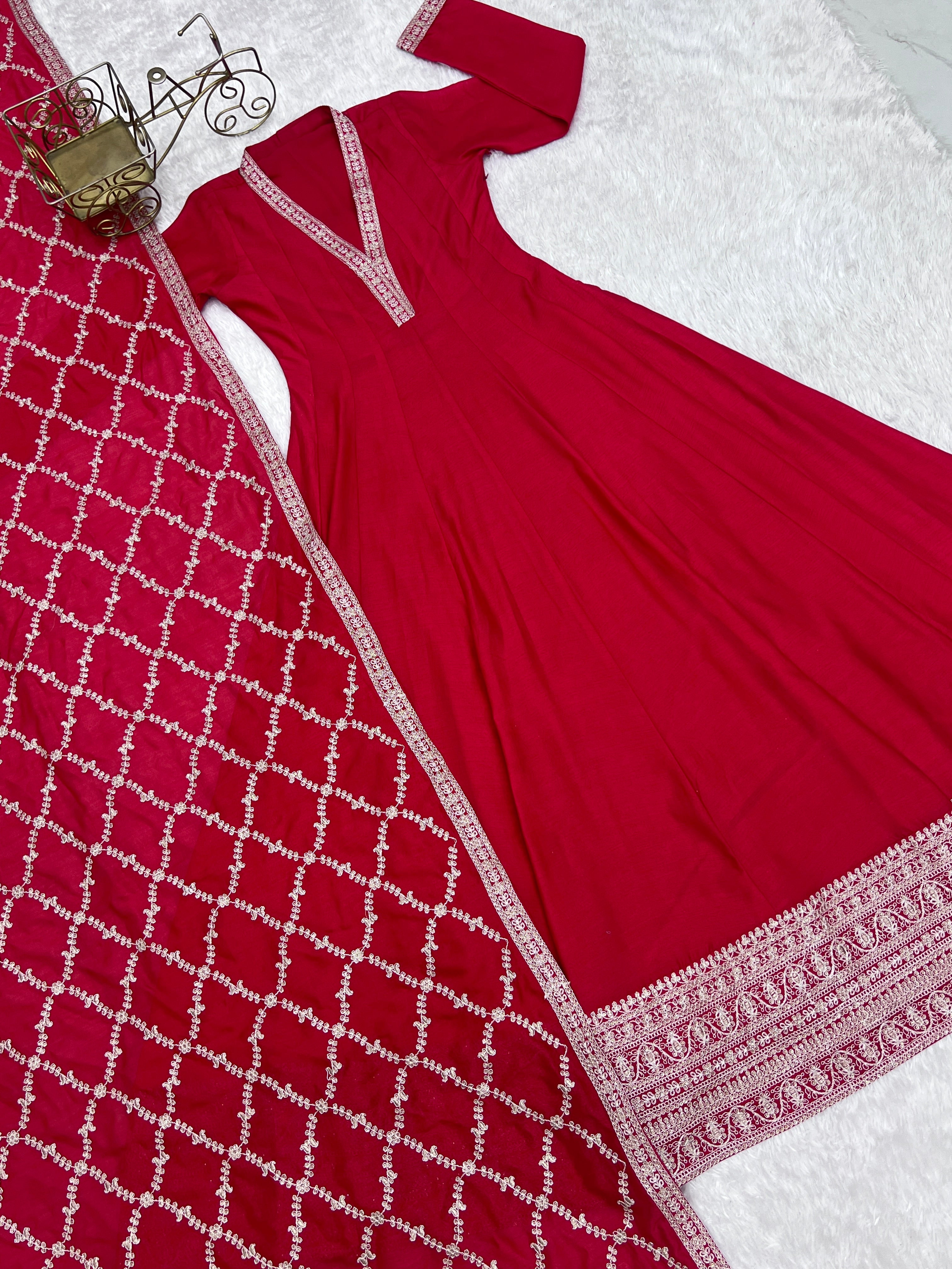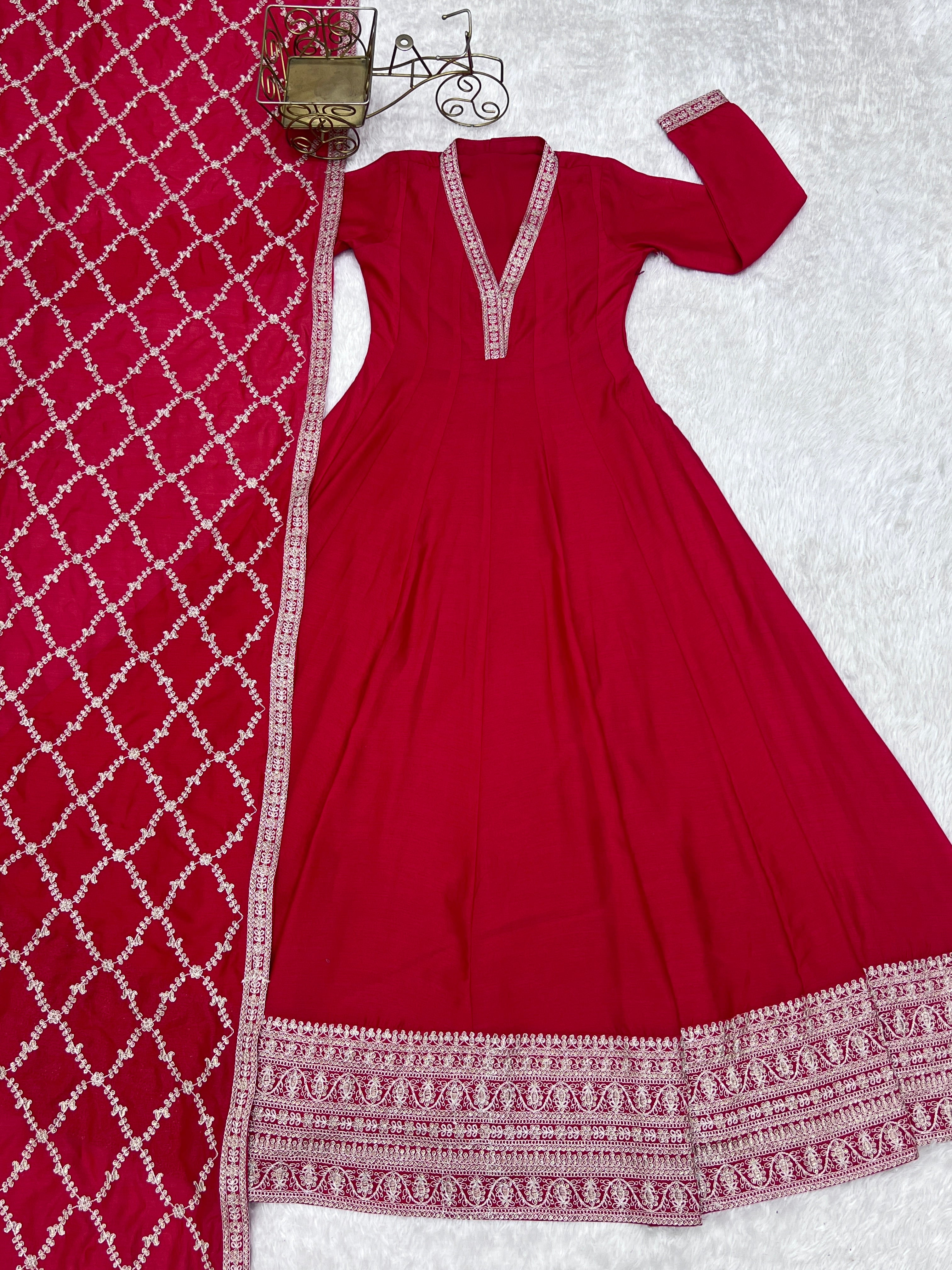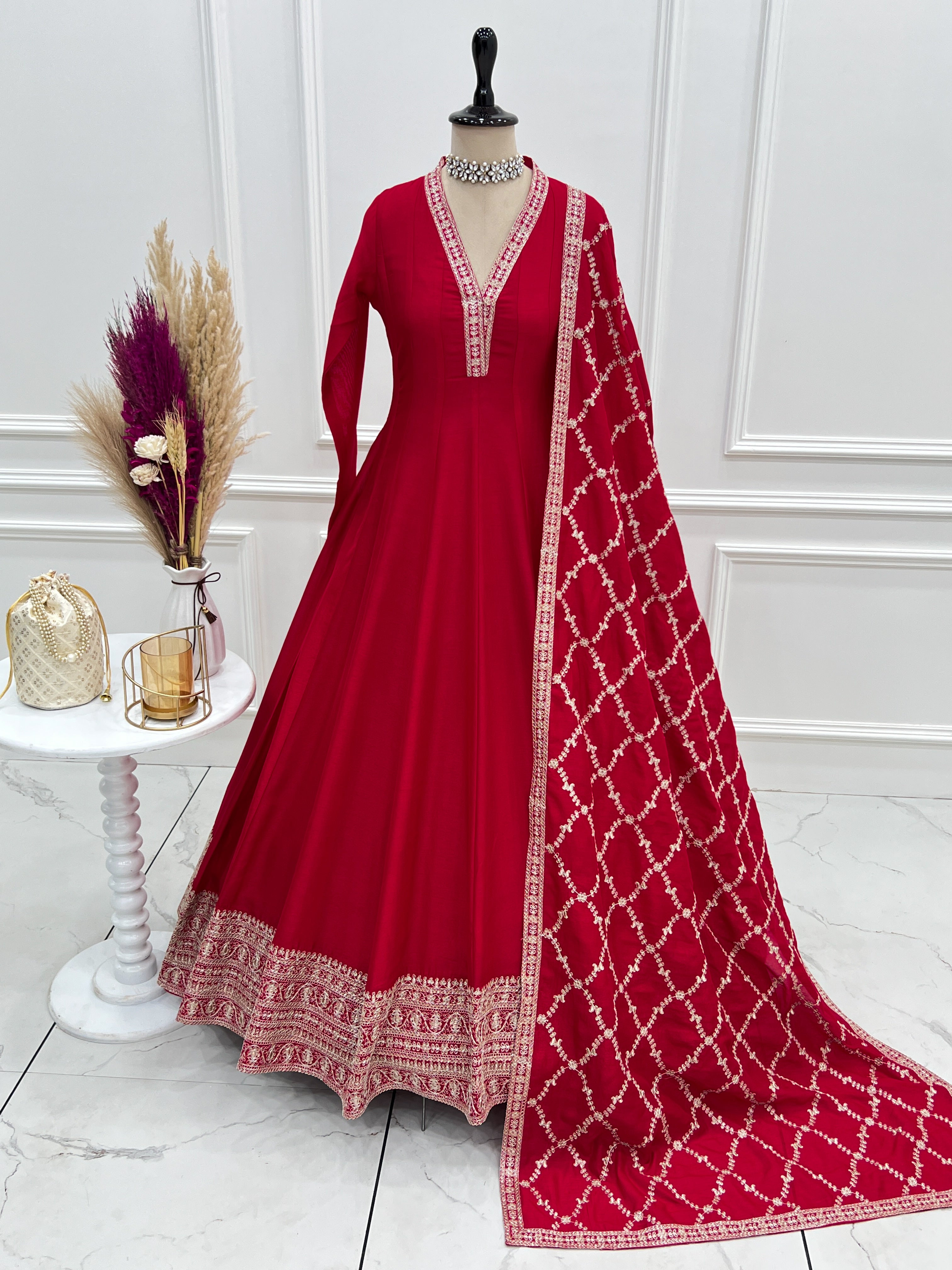 The Red Pure Vichitra Silk Kali Pattern Anarkali Gown is a perfect blend of traditional elegance and modern ethnic fashion. Crafted with premium pure Vichitra silk fabric, this designer Anarkali gown offers a rich texture, luxurious feel, and graceful flare.