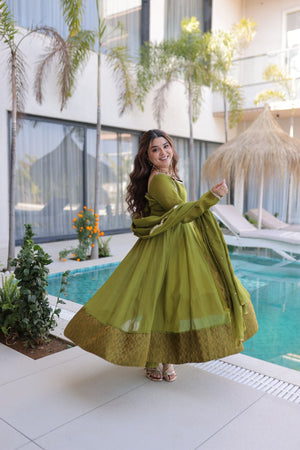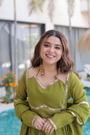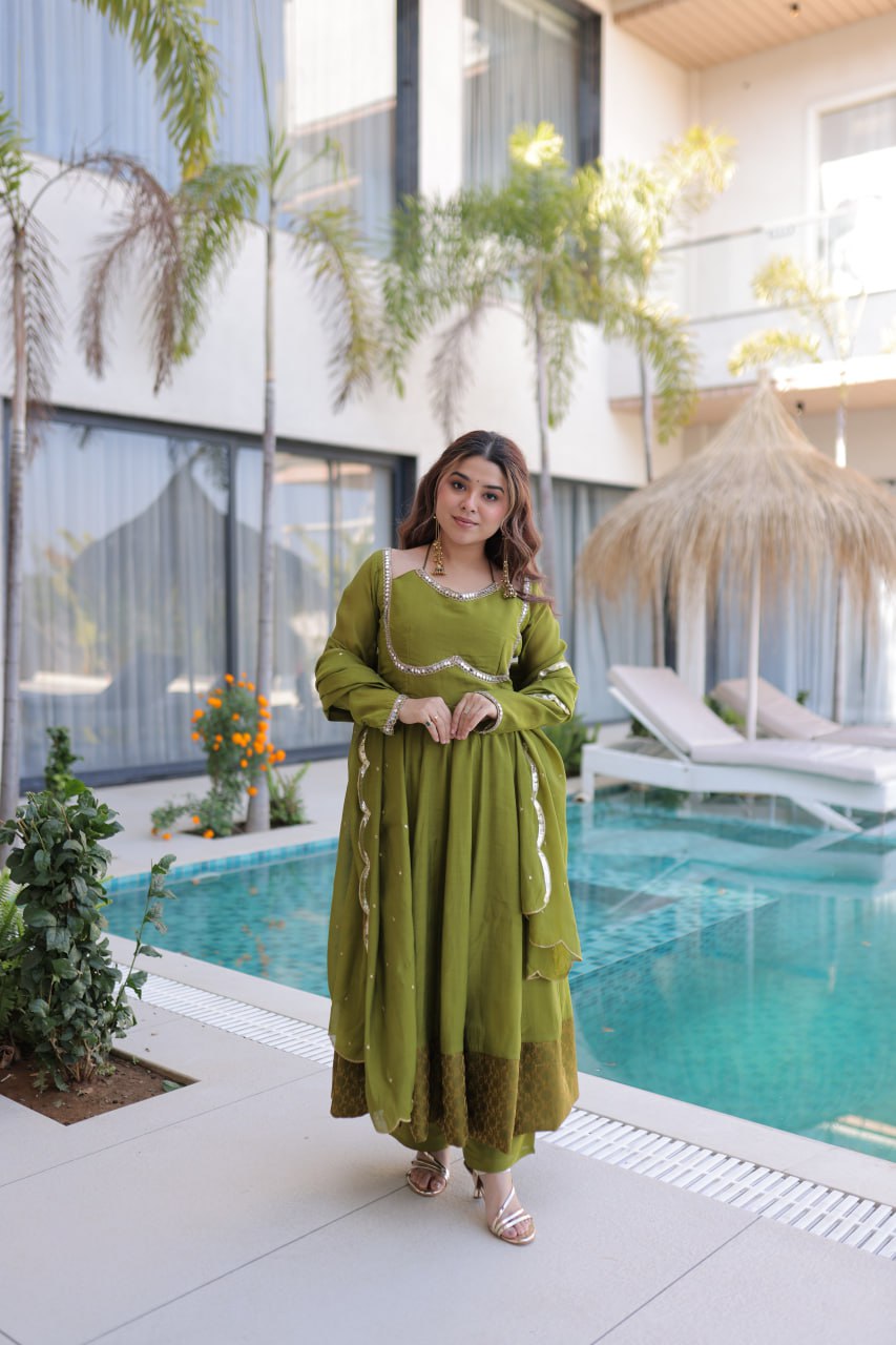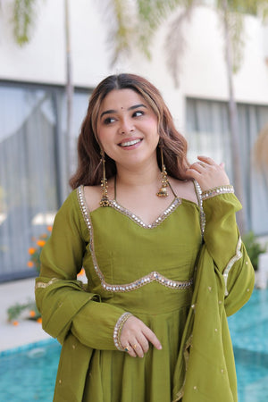 Sap Green Color Mul Chanderi With Rich Mirror Lace Work Suit