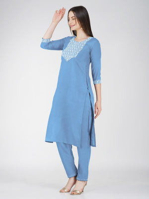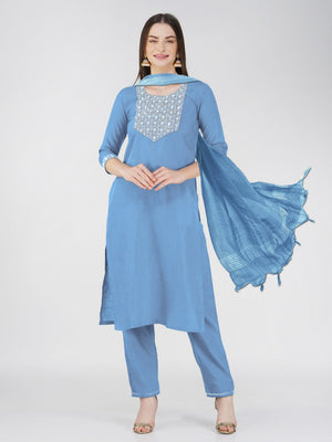 Sky Blue Color Cotton Blend With Embroidery Sequence Work Kurti Pant Dupatta