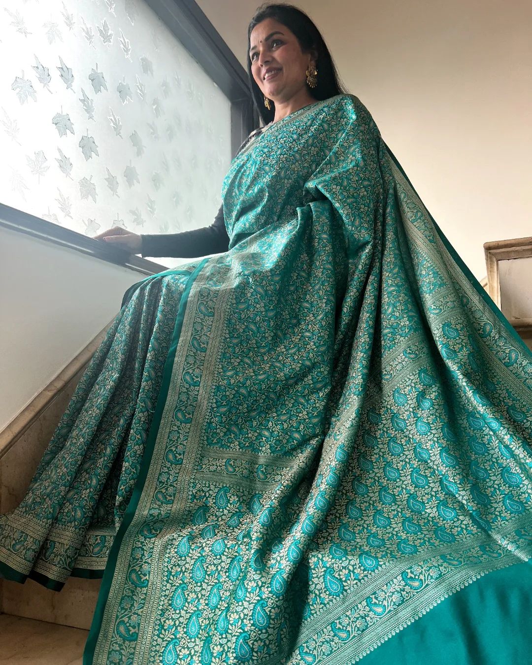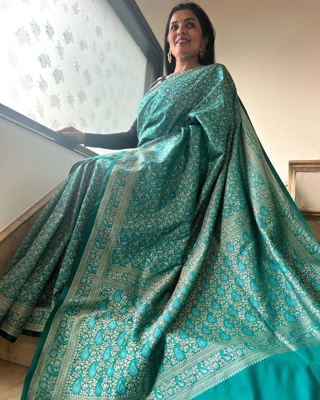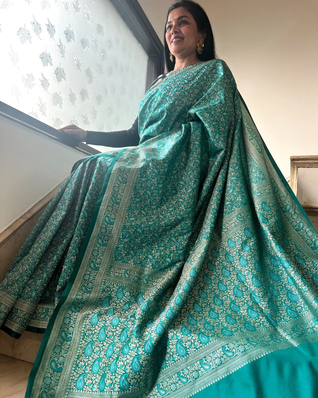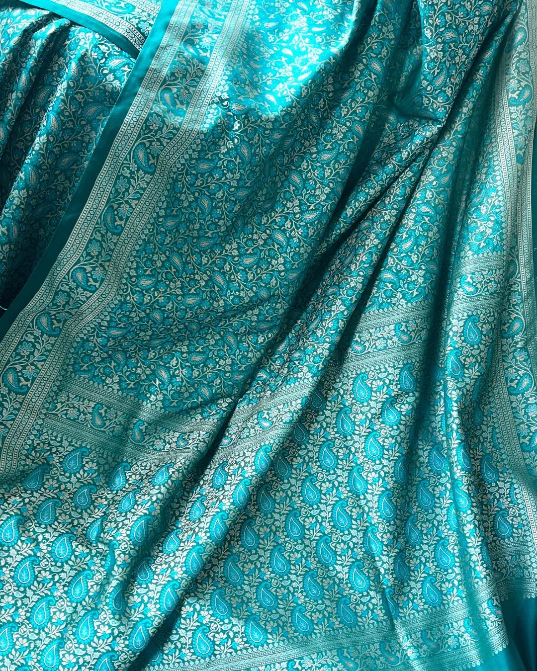 Silk Saree Is Adorned With Beautiful Zari Work In Form Of Traditional Motifs. This Beautiful Saree Is Elegantly Decorated With Gorgeous Solid Jacquard Weave That Gives A Perfect Look To The Outfit.