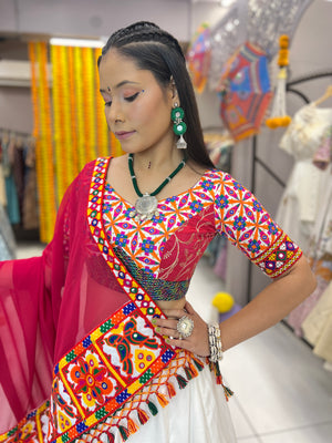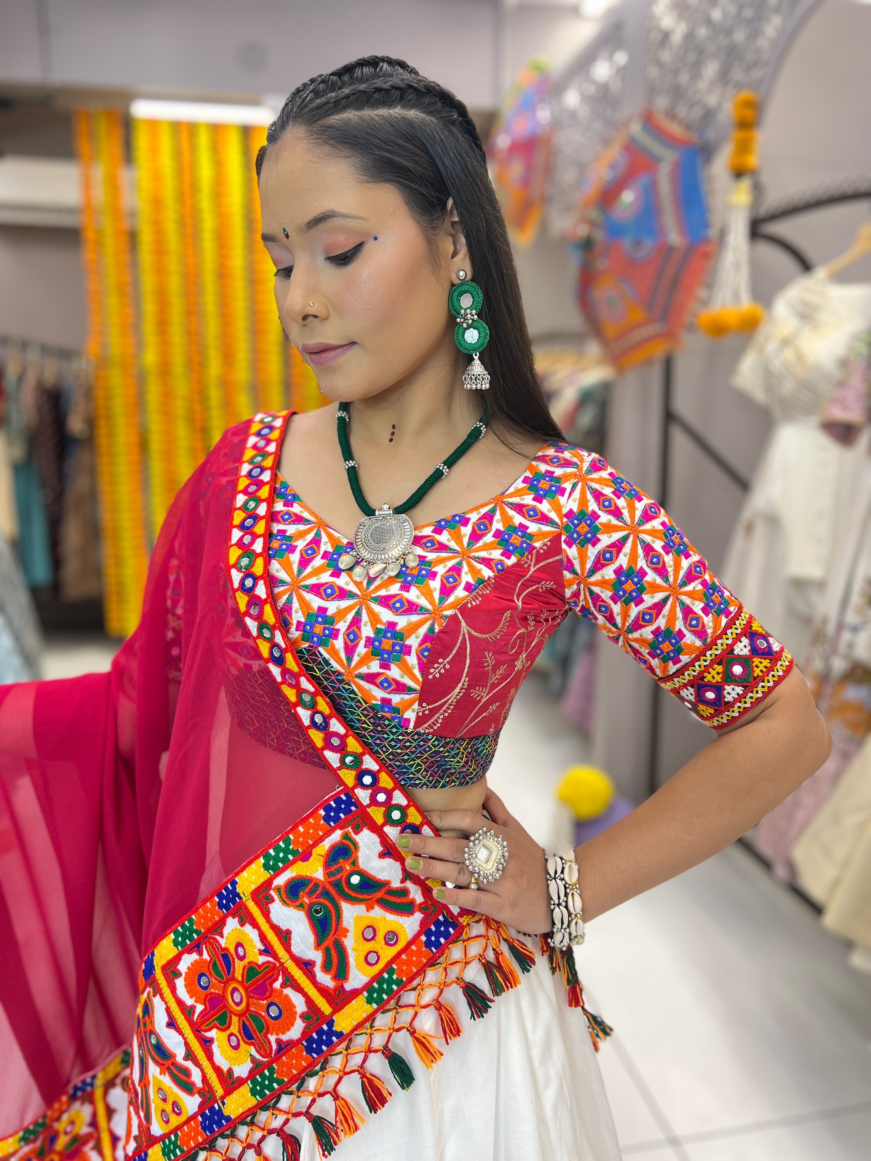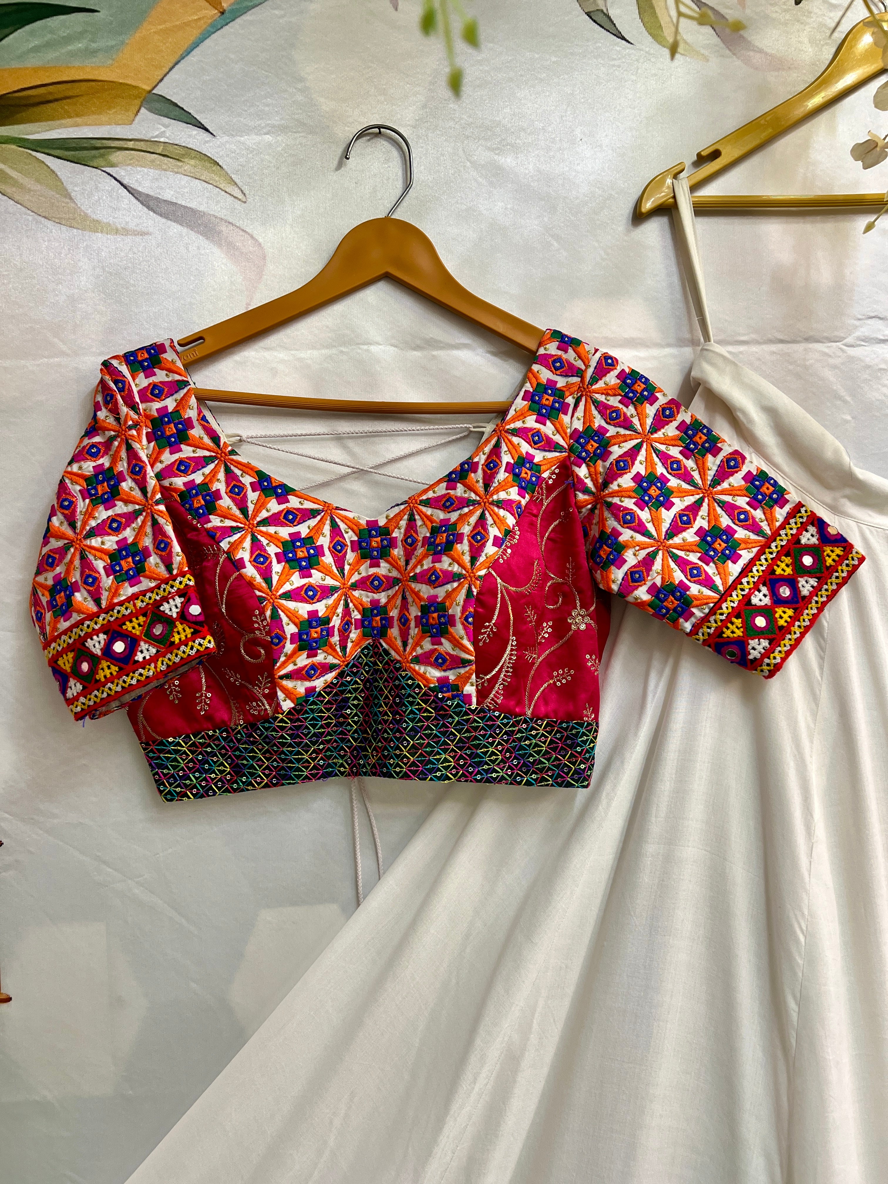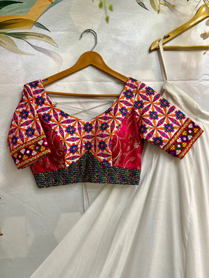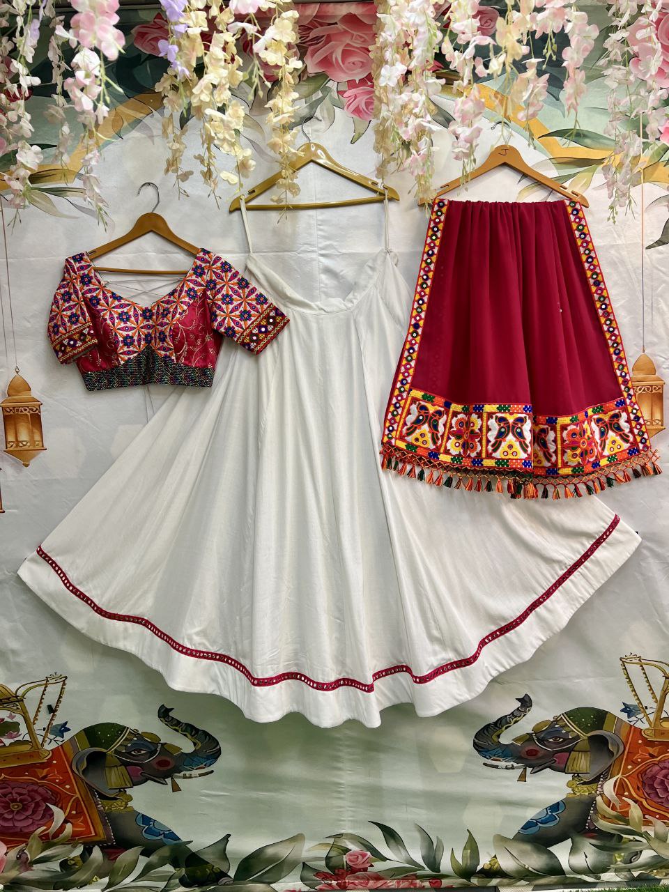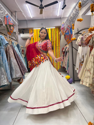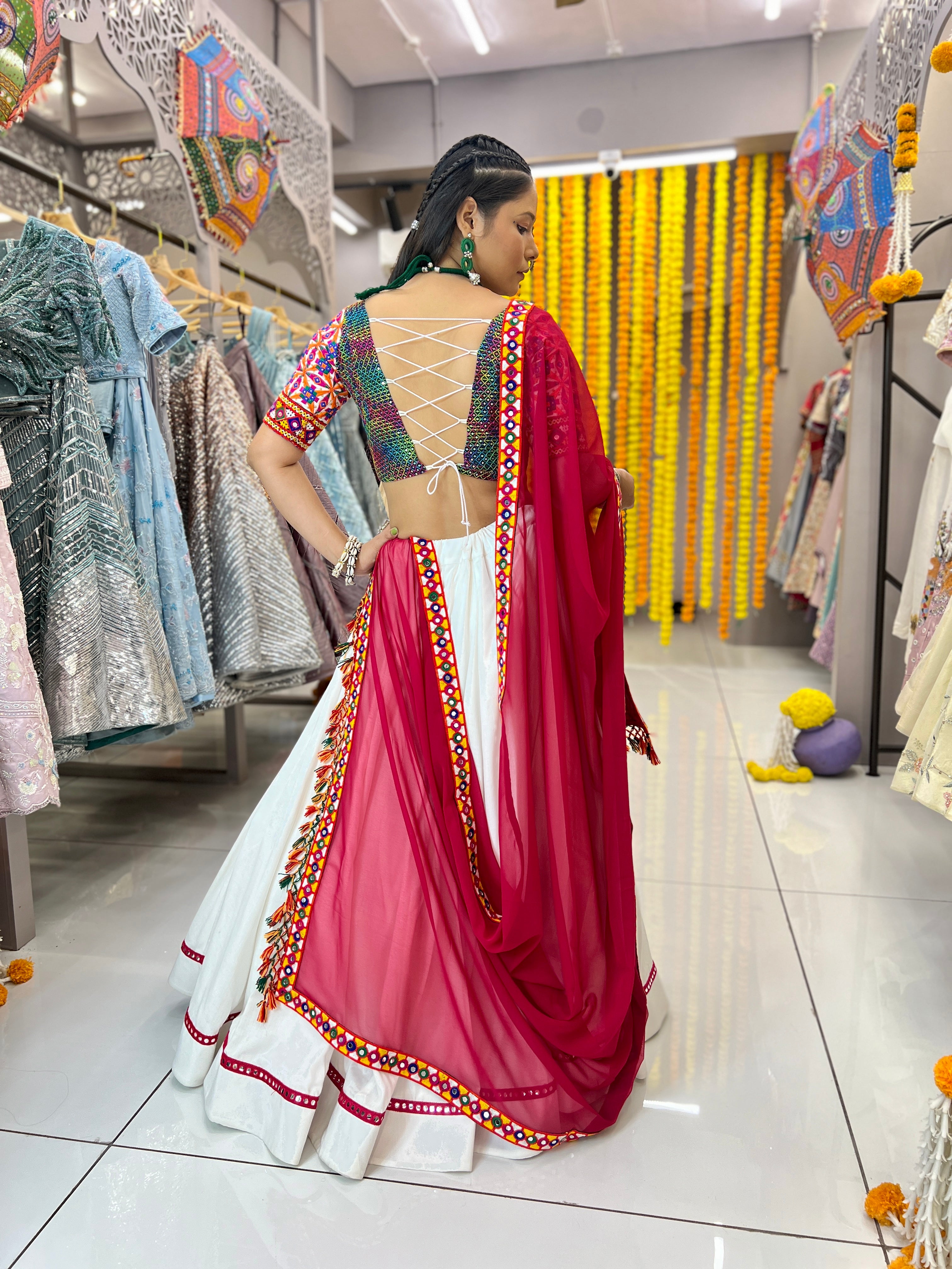 White Color Reyon Readymade Mirror Lace Multi Febric Cotton Full Stitched Lehenga Choli