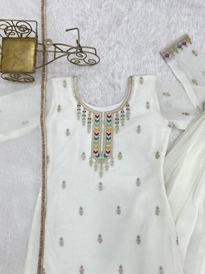 The outfit features intricate embroidery, sequence work, and zari detailing, adding a royal and festive charm. The elegant white color enhances its sophisticated appeal, making it a perfect choice for Eid celebrations, weddings, festive events, and parties.