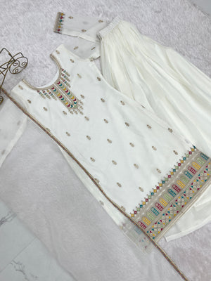 The White Pure Soft Silk Fancy Embroidery Sequence and Jari Work Sharara Suit is a beautiful blend of elegance, luxury, and traditional craftsmanship. Crafted from premium pure soft silk fabric, this designer sharara set offers a rich texture and graceful look.