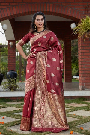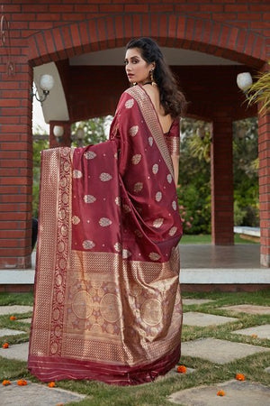 Wine Banarasi Weaving Saree With Blouse Fabric