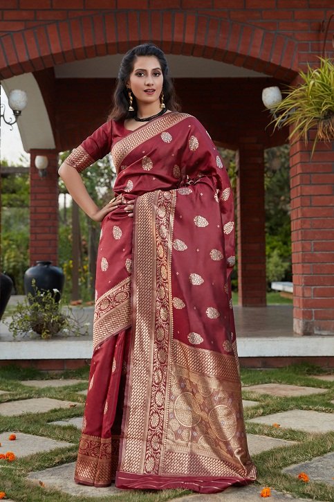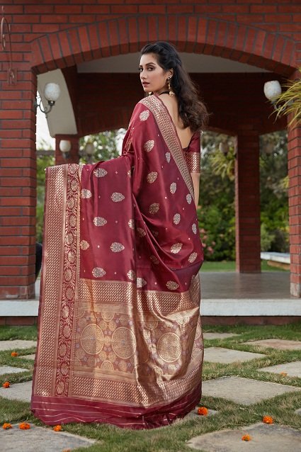 Wine Banarasi Silk Fabric Banarasi Weaving Silk Work In Saree.