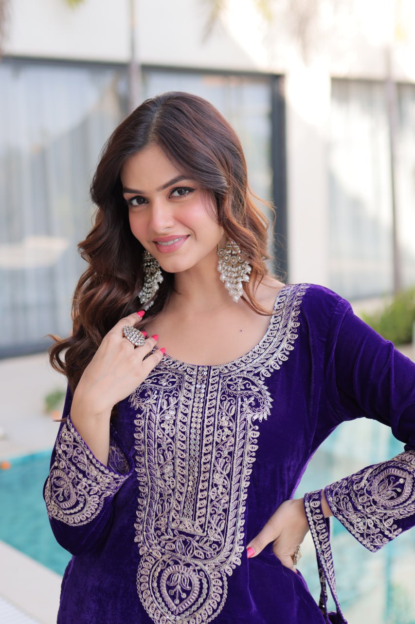 Purple Velvet With Rich Zari Embroidered And Real Mirror Work Suit