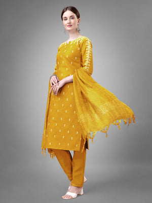Yellow Colour Rayon Print With Embroidery and Fancy Lace Work Kurti Pant Dupatta